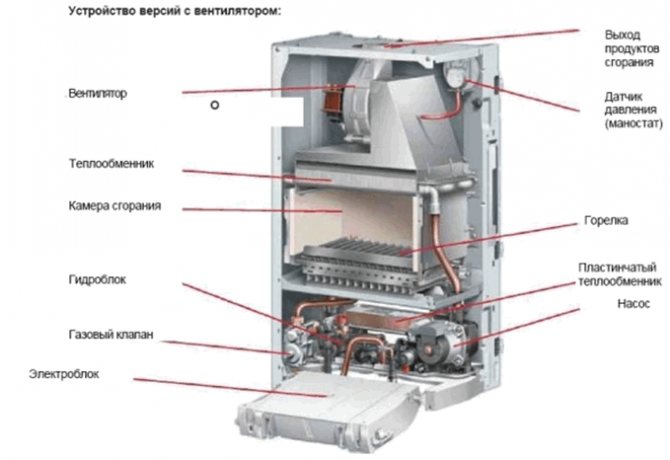 Въздухът се издухва в работната зона от вентилатор, той влиза в конструкцията на горелката. За да могат обаче продуктите от горенето успешно да преодолеят съпротивлението на трите хода на пламъчните тръби, един вентилатор не е достатъчен. Следователно тук е включен втори вентилатор - димоотвод, разположен в края на въздуховода, в началото на външния комин. В резултат на това максималната температура на продуктите от горенето на изхода на топлообменника на тръбата е 180 ° C, а ефективността на изгаряне на горивото е в диапазона 88–94%.