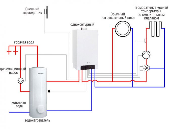 Не само трябва да закупите допълнително оборудване, но и да го инсталирате в котелно помещение, което изисква значителна площ. Стенните едноконтурни котли са по-удобни в този смисъл - те вече разполагат с някои от необходимите компоненти, остава само да се свърже водогреен котел за системата за БГВ със защитни елементи.