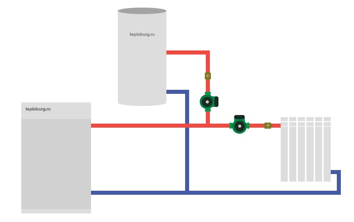 - Тук доминира трипътният клапан. Помпа е инсталирана директно в изхода на газовия котел, който циркулира и натрупва налягане. Следващата стъпка е инсталирането на трипътен клапан, който е свързан към термостата на котела. При нагряване на чешмяна вода или друга охлаждаща течност, нейният поток е насочен към отоплителната система и се дава приоритет на проникването на гореща среда в намотката на котела. Това се прави с помощта на допълнителна, втора помпа.И се оказва, че в този случай захранването с топла вода и отоплителната система са свързани паралелно и те могат да образуват две вериги, в тази затворена верига. И след котела е инсталирана допълнителна помпа, която помага да се регулира работата на термостата. Принципът на стартиране и спиране на процеса се контролира и от термостат, а именно при силно нагряване се получава принудително спиране на подаването на гориво, когато охлаждащата течност се охлади, горивото се преминава отново и горелката се запалва автоматично.