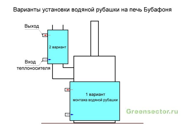 Печката Bubafonya може да се използва за организиране на нагряване на вода, като се прави водна риза върху тялото или тръбата