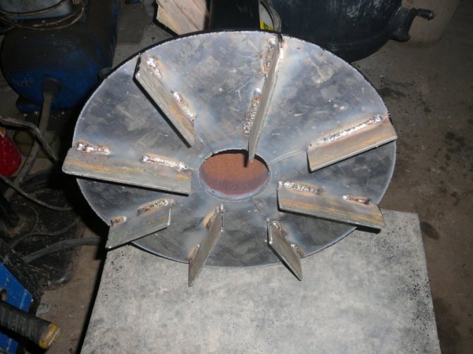 - Изрежете кръг от стомана. В центъра направете отвор за въздуховода. Заварете кръг и тръба.Подгответе облицовките на канала с необходимия размер и ги фиксирайте от долната страна на кръга. По този начин буталото на пещта е конструирано на няколко етапа.
