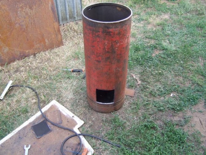 - В горната част на тялото направете маркировки за отвора на комина. Направете разрез. Дупката трябва да съответства на размерите на тръбата. Това ще позволи частите да бъдат запечатани. Заварете тръбата към тялото.