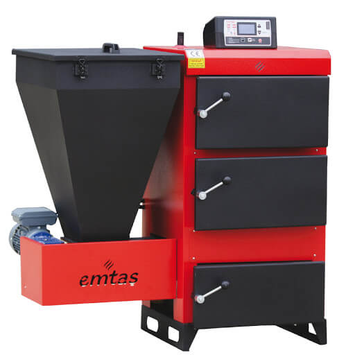 Компактен котел с двувинтова система за подаване осигурява висока ефективност на горене за почти всяко смачкано биогориво. Снабден е с чугунена ретортна горелка тип „анти шлака“, която позволява да се намали съдържанието на пепел дори при нискокачествени пелети.