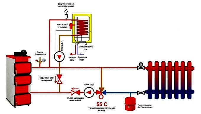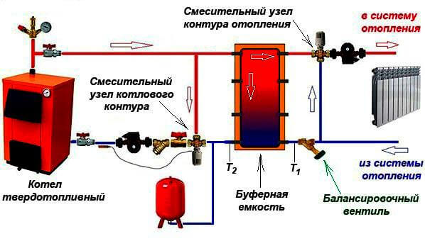 За да се изглади дефицитът, във веригата е инсталиран буферен резервоар, който вдига температурата за отопление на отоплителния кръг и консумира топлина за дълго време.