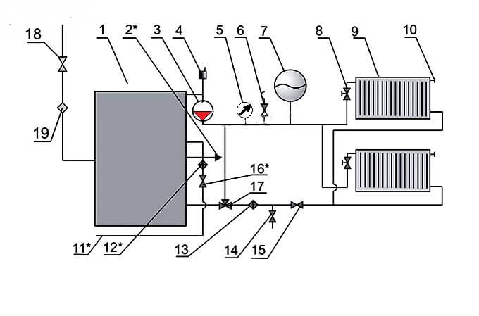 На захранващия тръбопровод е монтиран разширителен резервоар (7) за температурна компенсация на водата по време на отопление, предпазен клапан (6) за облекчаване на аварийното налягане в мрежата и манометър (5) за контрол на работното налягане на средата.