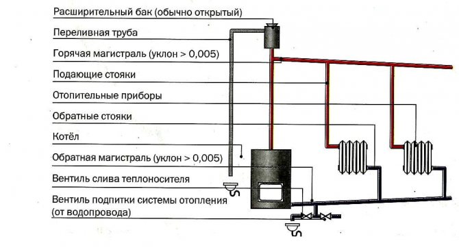 Основната разлика между отворена или гравитационна отоплителна система от затворена е пълното отсъствие на устройства за принудително движение на охлаждащата течност през тръбите. Този процес се случва само поради топлинното разширение на нагрятата течност.