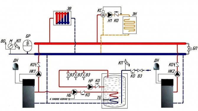 Подобна схема на котелното тяло включва включване на котел за индиректно отопление през помпите NB и HP, радиаторно отопление през помпите НК1 и НК2 и подово отопление през Н1.