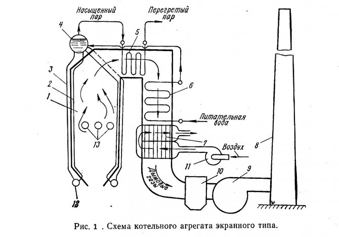 На фиг. 1. показва схема на котел от екранен тип с естествена циркулация, имащ факелна пещ за изгаряне на въглищен прах.