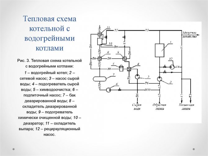 Термичната схема на котелното е предназначена за графично представяне на основното и спомагателното оборудване и връзката с помощта на инженерни мрежи. Такива схеми са задължителни при разработването на проектна документация, те се изпълняват с помощта на елементи, одобрени от SNIP.