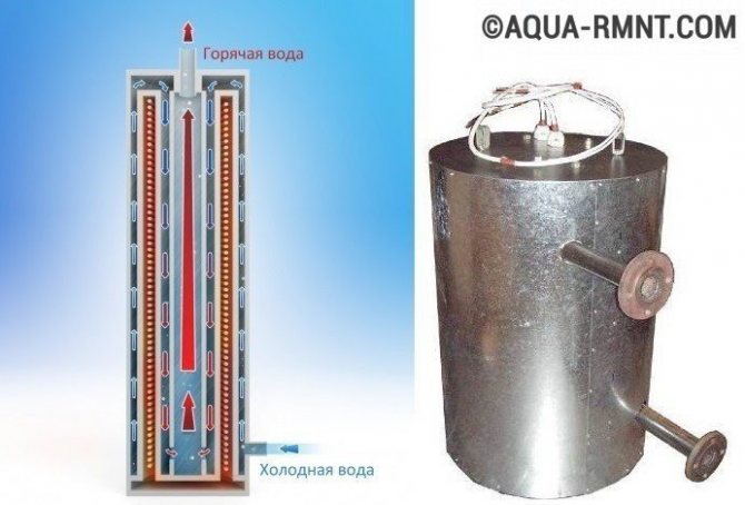 Две тръби са прикрепени към тялото. Единият от тях подава студена охлаждаща течност към котела, а другият отделя загрята вода. Вътрешността на корпуса е изцяло запълнена с отопляем елемент. Краищата могат да бъдат затворени с парчета стоманена мрежа.
