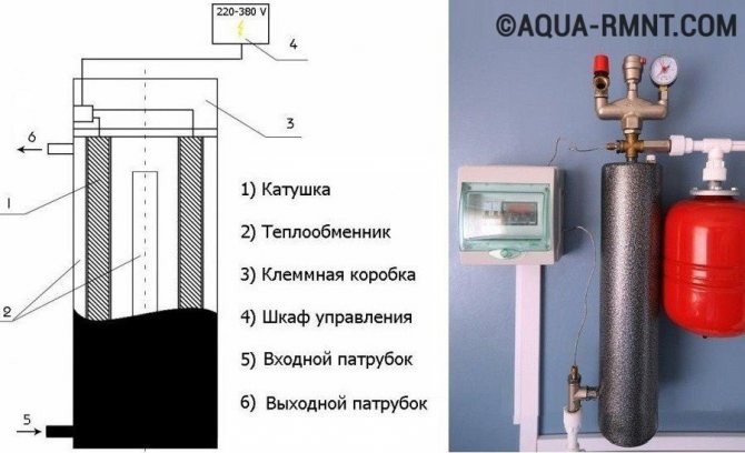 Нагряващият елемент може да бъде сглобен от стоманена телена пръчка или тел с диаметър 7 mm. Тялото на индукционната намотка едновременно служи като част от тръбопровода и може да бъде направено от пластмасови дебелостенни тръби с вътрешен диаметър около 50 mm.
