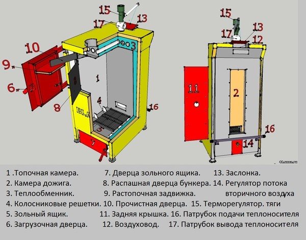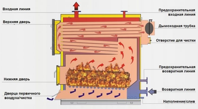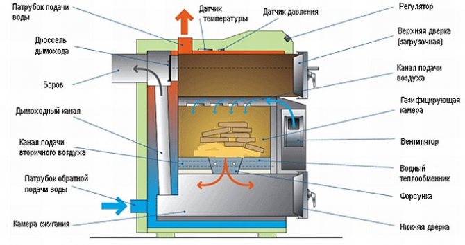 Но ако повечето от тях имат сходен дизайн, тогава схемата на пиролизния котел се различава много от тях. Това се дължи на работата по различни видове гориво.