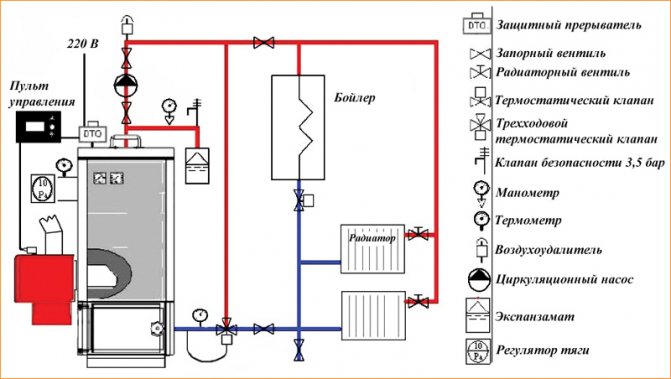 За да имате най-пълната представа за конструктивните характеристики на апарата и принципа на неговото действие, помислете за устройството на пиролизния котел и неговите схеми за свързване на снимката по-долу.