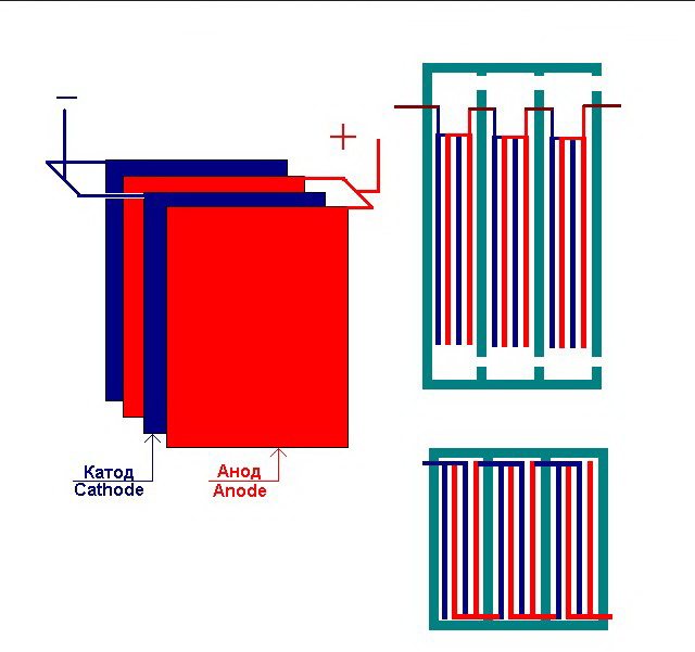 Електролизаторът може да съдържа от 1 до 30-40 или повече такива "клетки", плочите със същото име са свързани последователно.