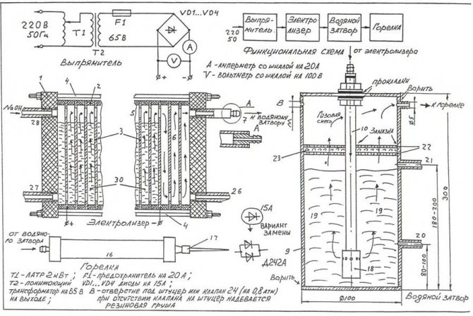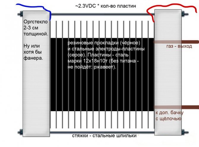 За да съберете най-простия електролизатор със собствените си ръце, можете да използвате чертежа, показан на фигурата.