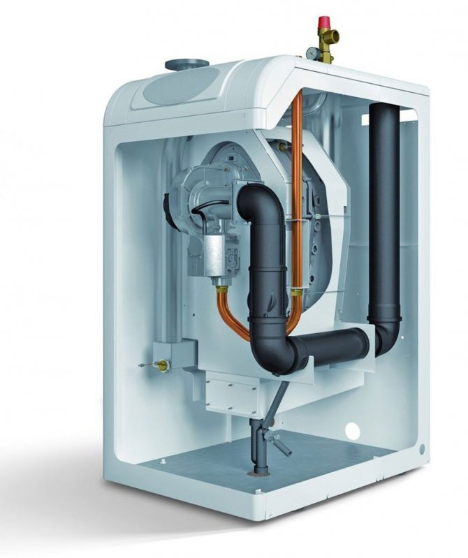 Разликата между енергонезависимия котел е липсата на всички агрегати, които се нуждаят от мощност. Няма вградена циркулационна помпа, турбовентилатор.