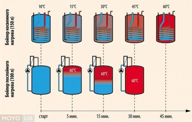 Две дюзи влизат в резервоара: през едната от тях се подава студена вода към котела, а през другата тя (вече гореща) се подава към външен потребител.