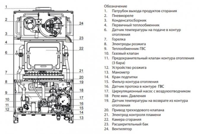 • Двуконтурното устройство има меден топлообменник - първичен и от неръждаема стомана - вторичен, за отопление на битова вода.