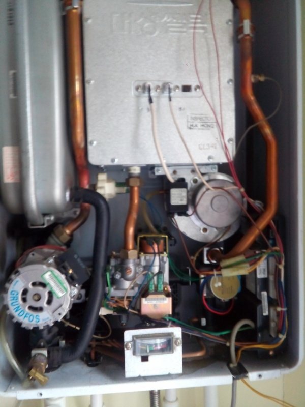 Изключете котела от контакта 220. Отстранете предния капак. Няма печати, няма тайни, всичко се вижда, 2 болта.