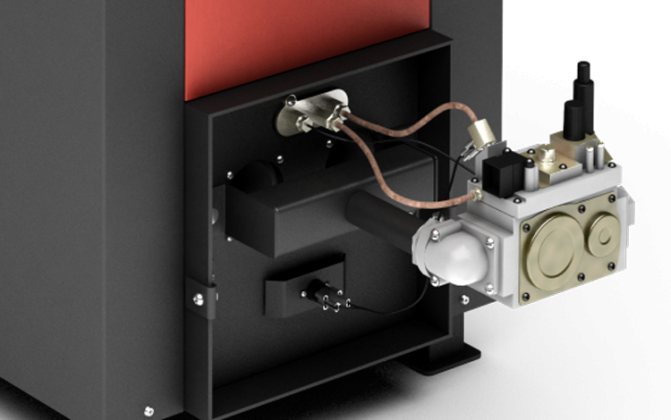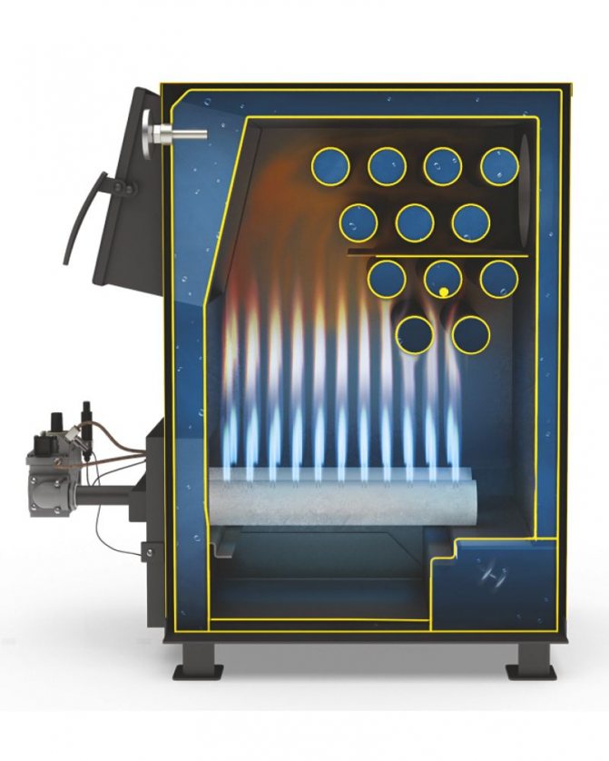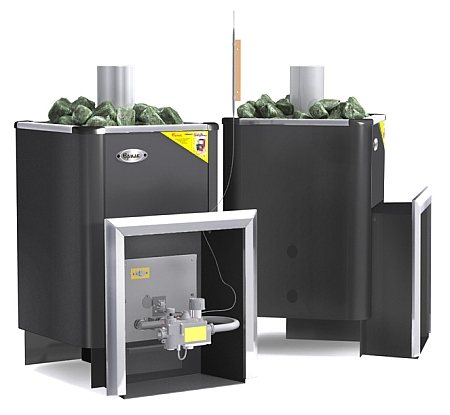 Ако трябва да превключите на газ, газова горелка със съответно монтиране (без заваряване) е инсталирана на вратата на пепелника или специално обозначена стойка. Въпреки това, конструкцията на топлообменника, предназначена за голям обем на горивната камера, акумулира много по-малко топлинна енергия при изгаряне на газ, ефективността остава само в рамките на 75-85%, както при изгаряне на висококачествено твърдо гориво.