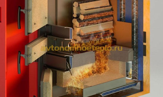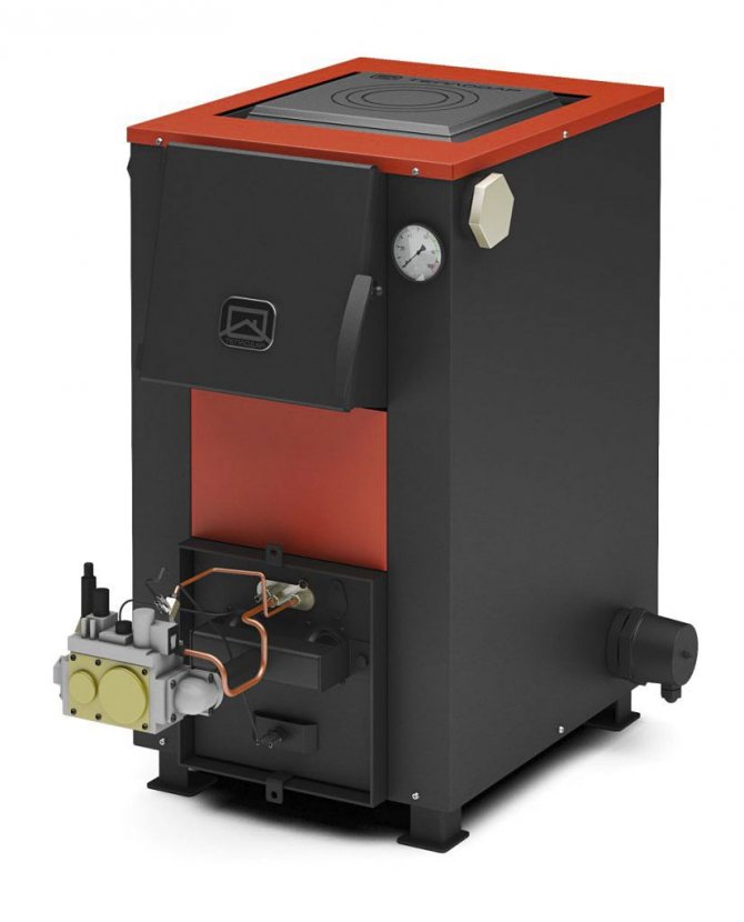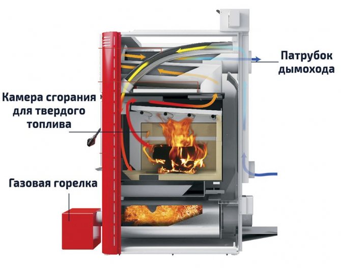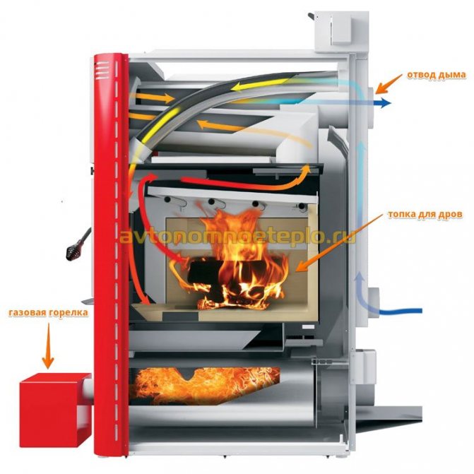Комбиниран модел с монтирана газова горелка. Схема на примера на модела Teplodar Kupper OK 15.