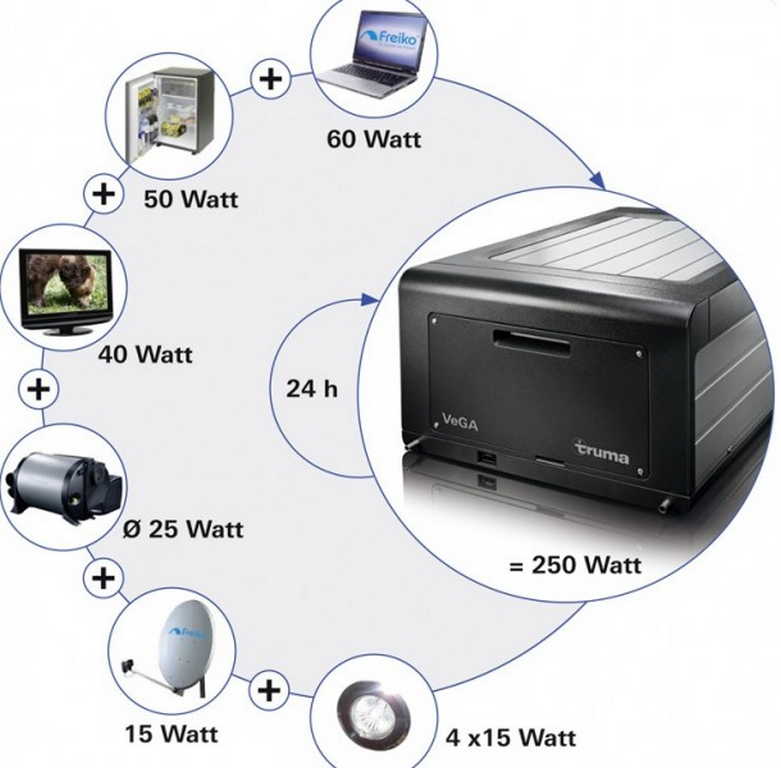 Vega използва втечнен нефтен газ (пропан / бутан), за да генерира водород и след това да го преобразува в електричество. Максималната производителност на устройството е 250 W / час или 6 kW / ден. По този начин VeGa прави възможно едновременното използване на множество консуматори на енергия в мобилен дом. От стандарт, напълнен с пропан, 11 кг. цилиндър, VeGa е в състояние да изцеди до 28 kW електроенергия. По този начин, в зависимост от консумацията на електроенергия, можете да живеете автономно до няколко седмици.