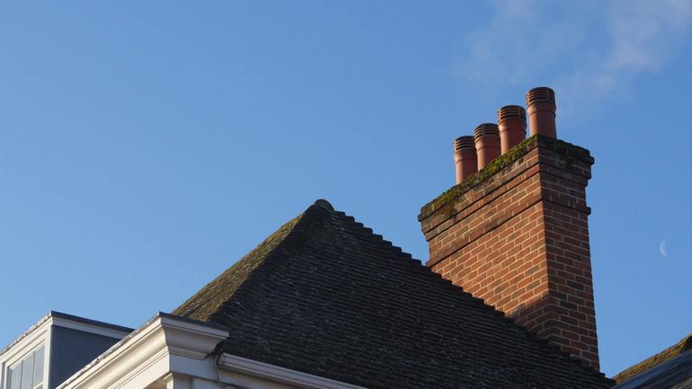 - коминът е облицован с тухли във външната стена на сградата;