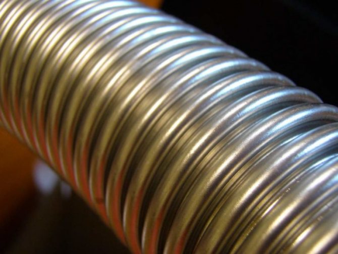 Гофрираната тръба за комин от неръждаема стомана визуално е подобна на алуминия, но тук приликите свършват. Основната разлика е способността да издържат на температури до 900 градуса без повреди и влошаване на ефективността на отстраняване на продуктите от горенето.