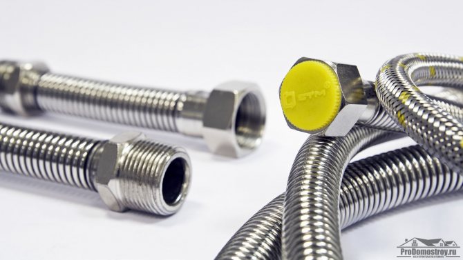 - Устойчивостта на удар на гофрирането от неръждаема стомана е ниска и ако е монтиран в зона, където рискът от механични повреди е голям, ще трябва да защитите тръбопровода със специален корпус.