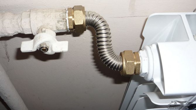 Цената на тръба от вода от неръждаема стомана с духало е по-висока от цената на продуктите за газово оборудване, което е оправдано от тяхната надеждност. Сам по себе си духалото е под формата на гофрирана тръба със закрепващи нипели в краищата. Свържете линията на духалото с помощта на шайби и гайки. Връзката може да издържи на налягане от 6 атм.