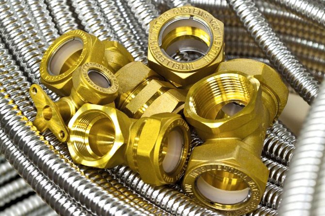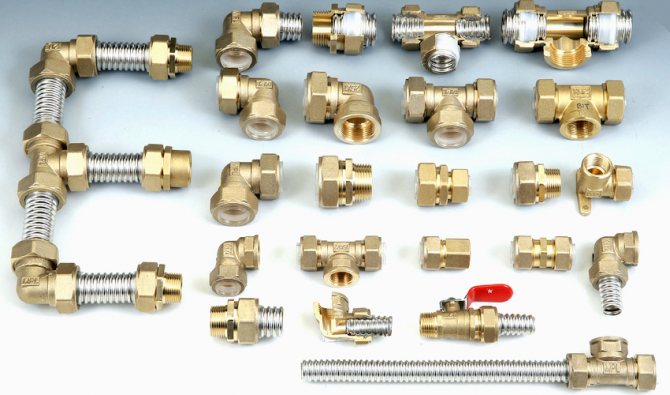 Видът на свързващите фитинги се избира според поставените цели, в съответствие с общите разходи по проекта, като се вземат предвид диаметърът на тръбите и условията на монтаж. Материалът за производство може да бъде метал или пластмаса. Металните фитинги са по-удобни и практични, поради което са особено популярни. За тяхното производство се използват неръждаема стомана и месинг. Пластмасовите фитинги се използват на кръстовището на комбинирани системи, както и за свързване към централни магистрали. Например, те се използват за свързване на гофрирани тръби с полипропилен.