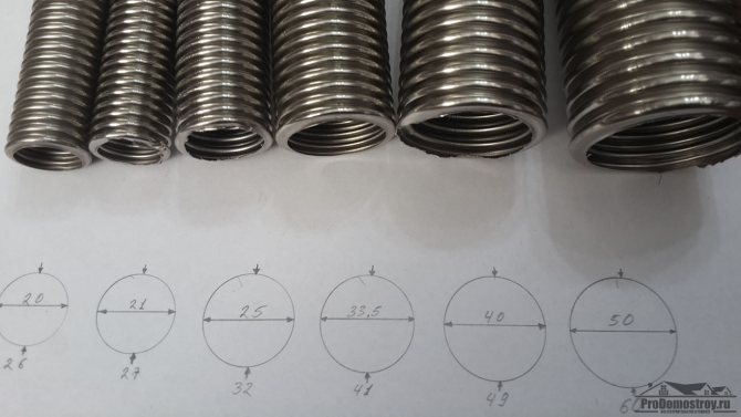 Произвеждат се продукти с различен диаметър, включително тръби с метър сечение. Такива продукти се използват за транспортиране на различни течности в производството. Модели с други размери също могат да бъдат направени по поръчка, но цената на гофрирана тръба от неръждаема стомана, направена по този начин, ще бъде много по-висока.
