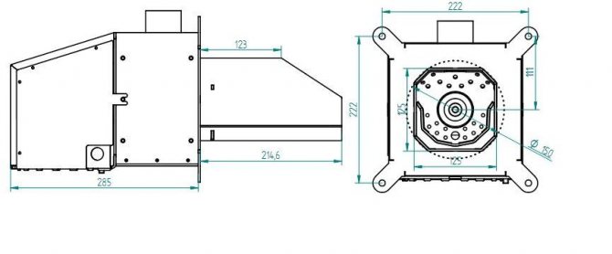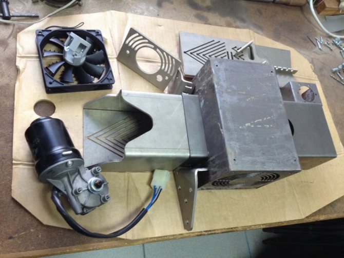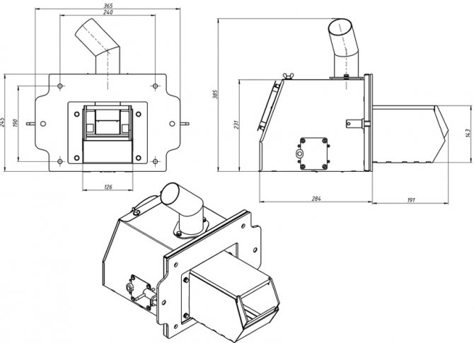За да завъртите механизма, се нуждаете от лагери, нискоскоростен мотор (електрически) и скоростна кутия. Вентилаторът може да бъде закупен в магазина. Той е фиксиран върху пластмасата, в която мястото вече е подготвено. Плочата е направена въз основа на чертежа. Конфигурацията зависи от самата врата на котела. Чертеж на горелката може да се види на тази снимка.