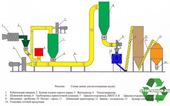 В трошачката суровината се раздробява до състоянието на брашно и след това това брашно чрез въздушни конвейери навлиза в циклоните (1-ви циклон за първично отделяне на дървесното брашно от въздуха, 2-ри циклон за вторично, окончателно отделяне) . Освен това, след отделяне на въздуха, дървеното брашно се подава към прав винтов транспортьор. След това от прав към наклонен винтов транспортьор до бункера на пресата за пелети, в който е монтиран смесителят.