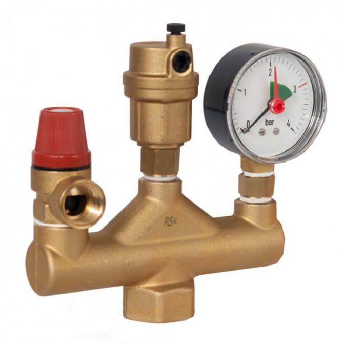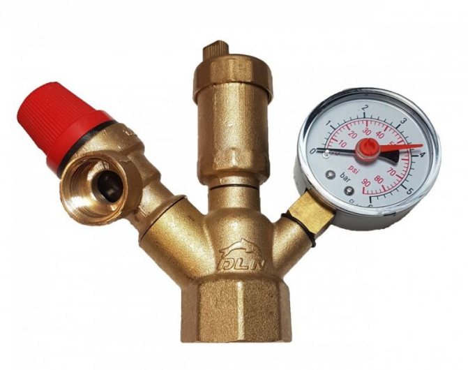 Дизайнът се състои от следните елементи: предпазен клапан, манометър и автоматичен обезвъздушител. Всички тези устройства се намират в метален корпус с резбови връзки.