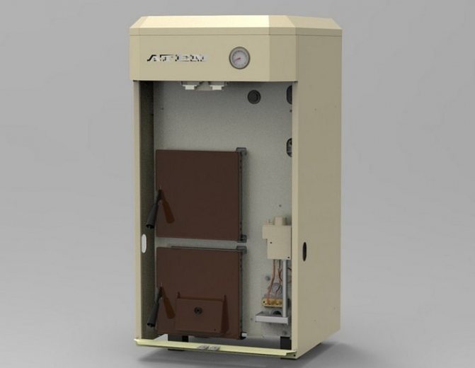 Устройството на класически котел на твърдо гориво не е трудно: дърва за огрев изгарят в камината, пламъкът загрява резервоара за топлообменник, топлата вода отделя топлина на батериите. Основният му проблем вече беше споменат: на всеки няколко часа трябва да зареждате дърва за огрев или въглища и да премахвате пепелта.