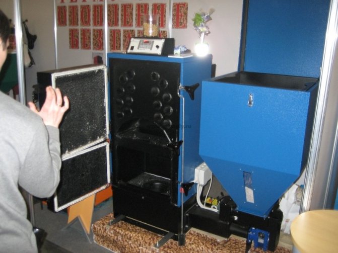 - Автоматично подаване или ръчно. За да се организира автоматично подаване, ще е необходимо повече място, тъй като ще е необходимо да се монтира голям резервоар до котела. И не всички видове гориво са подходящи за автоматизация, най-често те са малки свободно течащи пелети.
