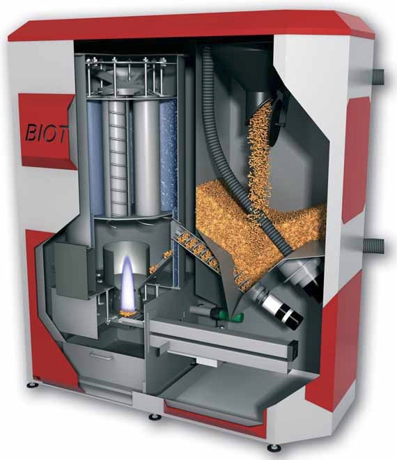 Котелът BIOTECH може да се управлява с помощта на винт и / или пневматична система за подаване на пелети от бункера до горелката.
