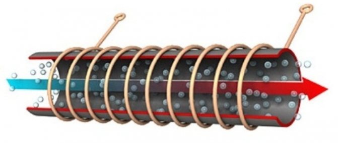 Нагревателният елемент е безшевна метална тръба, която се намира вътре в него. Те са разположени вътре в намотката, която е поставена вътре в затворен корпус. През него се предава променлив електрически ток, в резултат на което металните тръби се нагряват и съответно течността, която тече през тях.