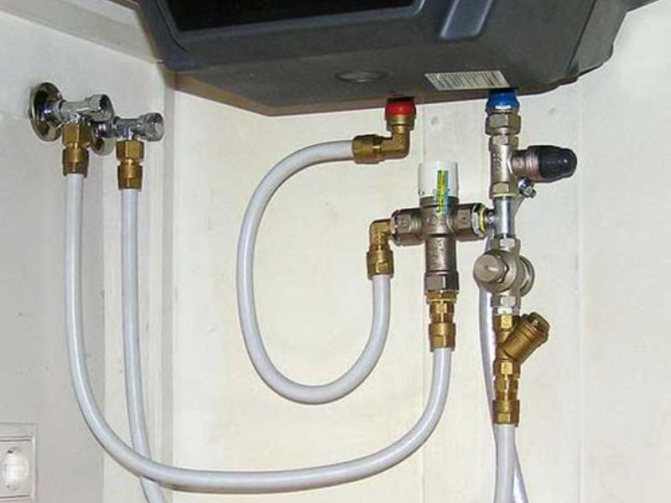 Сега трябва да започнете да свързвате свободните краища на маркучите. Така че краят, към който ще тече студена вода, е свързан с водопровода. В този момент предварително инсталирайте клапан или кран, който при необходимост ще ви позволи да изключите водоснабдяването.Не пренебрегвайте тази препоръка, тъй като котелът може да се повреди по време на работа или да изисква подмяна на някои резервни части. Свободният край на другия маркуч трябва да бъде свързан към тръбата, която отива към смесителя.