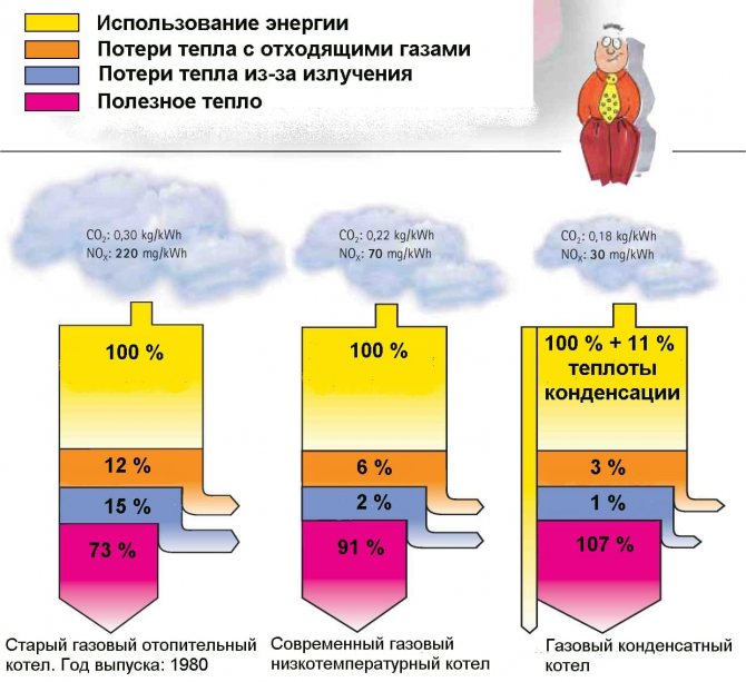 - Пълно използване на топлината от изгарянето на газ... Ако традиционните котли използват така наречената по-ниска топлина (топлина, отделена по време на химичната реакция на окисляване на въглеводороди), тогава кондензационните котли използват по-високата топлина на горене. Той включва топлината, отделена по време на кондензацията на водни пари, един от продуктите от изгарянето на природен газ.