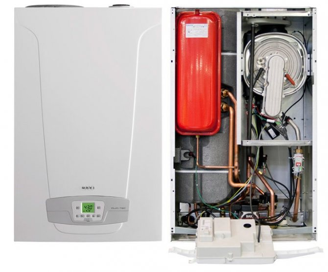 - Тип горелка (атмосферно или турбо). В първия случай продуктите от горенето се отвеждат в комина или вентилационния канал чрез естествена тяга, произтичаща от нагряването им. Въздухът за горелката се взима от котелното помещение. Във втория случай както поемането на въздух, така и отстраняването на продуктите от горенето се принуждават през коаксиален (двустенни) въздуховод, преминаващ през външната стена на къщата. В същото време захранващият въздух във външната тръба изключва отоплението на стената, което прави възможно монтирането на коаксиален комин в дървена къща без допълнителна термична защита;