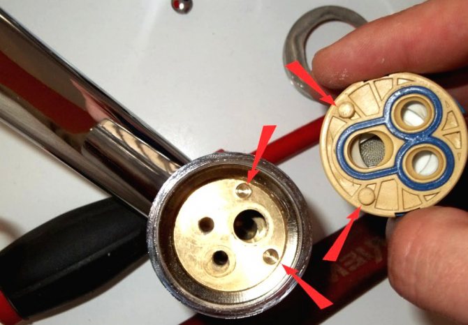 - След това заменете счупената касета с нова. В долната част има дупки, които се вкарват в подходящите издатини на крана.