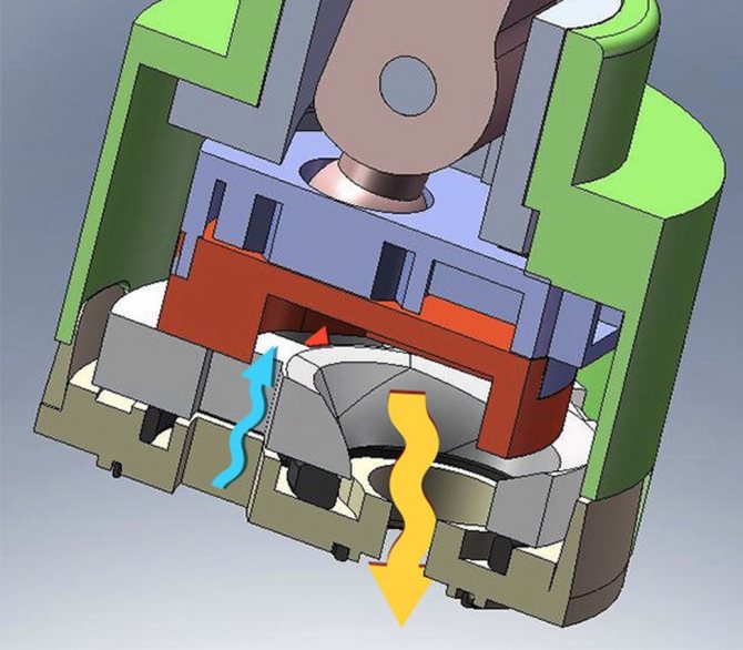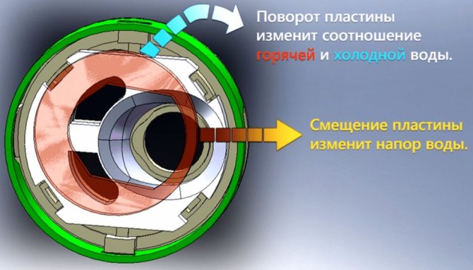 Долният керамичен диск е монтиран неподвижно - движейки се спрямо него, горният диск затваря и отваря отворите, с помощта на които се регулира водният поток.