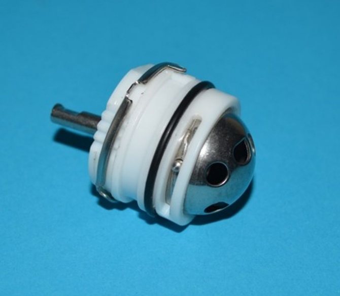- Топка. Основната част на устройството е куха метална топка с отвори. При завъртане отворите му се подравняват с каналите в корпуса на миксера. По този начин се смесват топла и студена вода. Днес такива модели се считат за остарели. Недостатъкът на този дизайн е образуването на варовик върху повърхността на топката, особено ако миксерът е бил неактивен дълго време.