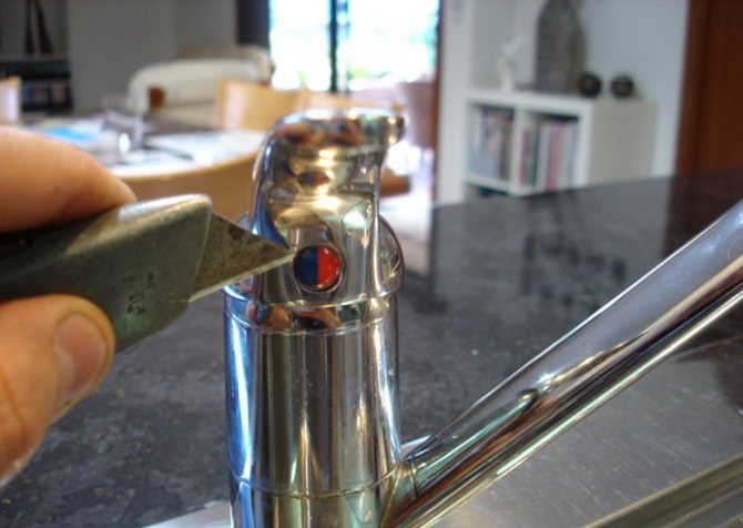 - Изключваме подаването на вода от щранга и повдигаме лоста на миксера до най-високото положение. В долната му част, отпред, намираме пластмасова капачка с червена и синя маркировка - внимателно я извадете с нож или тънка отвертка.Под него ще намерите малък винт, чрез развиване на който лесно можете да свалите лоста на миксера. Не си струва да развиете напълно винта, достатъчно е да го разхлабите малко.