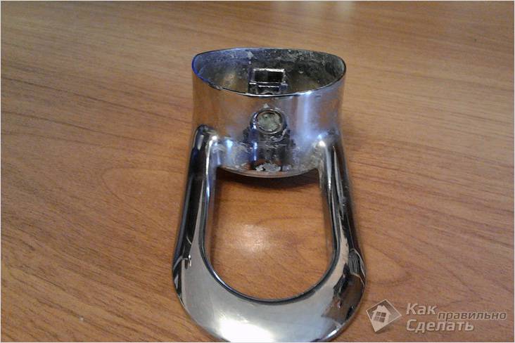- Следващото препятствие пред нас е хромираната капачка. Трудността тук е, че той се придържа с времето и може да бъде доста проблематично да го изключите. Можете, разбира се, да направите това с ключ, но тази част е толкова деликатна, че може лесно да бъде повредена. Въпреки че това по никакъв начин няма да повлияе на работата на устройството. Само дето външният вид ще страда. Следователно, за да избегнете ненужни жертви, използвайте WD-40 преди да развиете капачката, това значително ще опрости задачата.