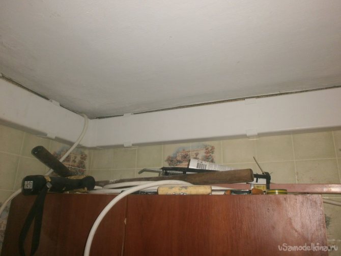 Само след като разбрах как ще отиде по-нататък, разбрах, че не трябва да минава под самия таван, трябва да отстъпите 3 см, така че наслагването на стената да се побере без изкривяване и да е по-лесно да се пробият дупки за него. Не по-рано казано от направено: минус три сантиметра.