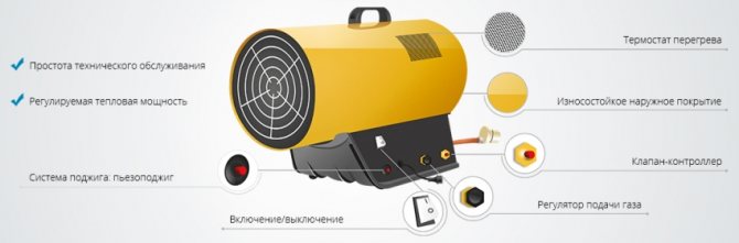 Вентилаторът се пуска в действие посредством електрически мотор... Вдухва студен въздух във вътрешността на уреда. След това с помощта на горелка, електрическо запалване или пиезоелектричен елемент газът се запалва. Потоците горещ въздух под налягане излизат навън и отопляват стаята. Повечето съвременни пистолети имат термостат, който ви позволява да регулирате подаването на топлина.