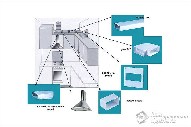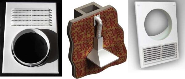 Като въздуховоди, през които неприятните миризми и пари се отвеждат към люка на вентилационната шахта, се използват специални въздуховоди, направени под формата на: